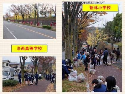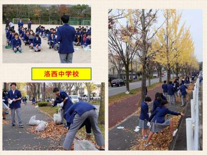 テストの最終日,午後からは恒例となっている一斉清掃に取り組みました。洛西高等学校,新林小学校,境谷小学校,洛西中学校の小中校4校での取組です。新林本通り,洛西高等学校の1ブロック南から国道9号線までの東西の歩道を4校で分担します。銀杏が綺麗いに色づいた後,落ち葉となって歩道を埋め尽くしています。生徒たちは,丁寧に落ち葉を集め袋に詰めていました。端から端まで歩いてみたのですが,なかなかどうして圧巻でした。少しでも地域のお役にたてればと思います。本当に気持ちの良い午後でした。