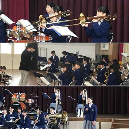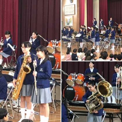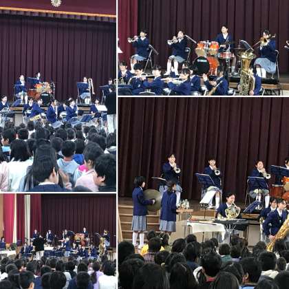 今日は,新林小学校で学習発表会が行われました。その学習発表会の午後,本校の吹奏楽部がお招きをいただき,演奏をさせていただく機会を得ました。体育館には午前中に緊張の中,舞台発表をした児童たちが,リラックスした表情で待っていてくれました。部員の中には,新林小学校出身の生徒もいます。懐かしい体育館で,お世話になった先生がたや後輩たちを前にしての演奏は,また違った緊張感があったかも知れません。児童や,先生方も少し大人びた卒業生が眩しかったのではないかなと思います。