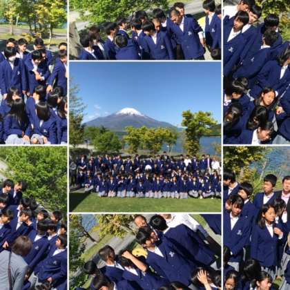 1泊目お世話になったペンションのオーナーさんとのお別れです。ありがとうございました。その後,富士山をバックに記念撮影です。みんな元気です。