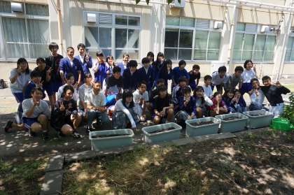 最初に,生徒会長から,今日の作業の説明があり,学級委員長を中心に10個のプランターに,福島から送っていただいたひまわりの種をまきました。その後,呼びかけで集まってくれたボランティア生徒が水をまき,