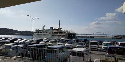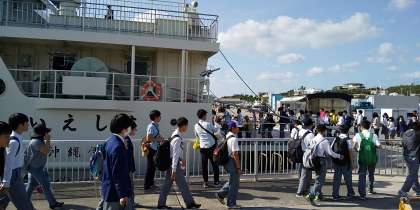 嘉数高台を後にしたバスは,予定通り本島中部・国頭郡の本部(もとぶ)港に到着しました。今日・明日の宿泊地・伊江島(いえじま)に渡るフェリーに乗船します。午後5時出港予定で30分の船旅です。「うおー!すげー!」って言ってます,とのこと。