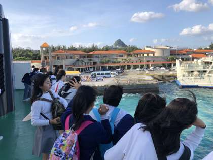 予定通り午後5時30分に,伊江港に入港します。「ようこそ,洛西中学校」の横断幕を掲げて出迎えていただきました。歓迎を受け,みんな喜んで手をふってます。