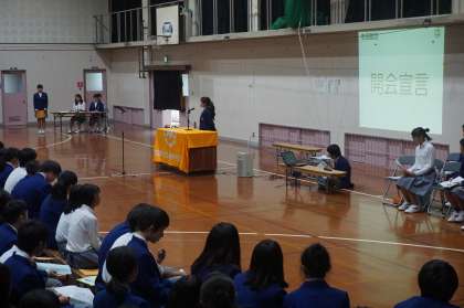 校歌斉唱・開会のあいさつのあと,生徒会本部より洛西中学校の現状分析の発表がありました。良い点として,「行事で盛り上がる。先輩・後輩の仲がいい。41年間の歴史とたくさんの自然」など。悪い点として,「校歌の歌声が小さい。校則が守れない。集会中落ち着きがない。廊下を走る人がいる。」など。改善するために,「考え判断して行動する。周りの人が注意する。意識の向上を図る」などの意見が出ました。生徒会としても今後の取組の中で,考えていくとのことです。続いて,生徒会のスローガンが発表されました。今年のスローガンは,「挑(いどむ)〜どんなことにも恐れず挑戦・積極的に失敗を怖がらず課題に挑む」です。若さの特権ですね。