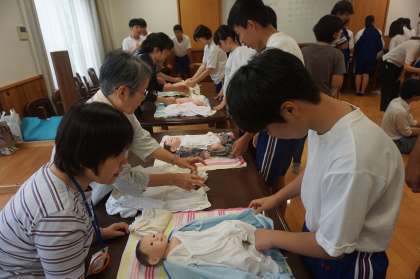 赤ちゃん人形を使って,おむつや着替えなどの赤ちゃんの世話を体験しました。