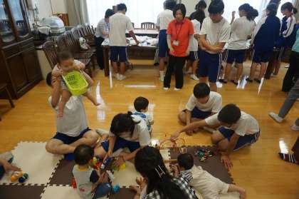児童館を利用されている地域のお母さん方にも赤ちゃんと一緒にご来校いただき,実際に赤ちゃんを抱っこさせていただきました。とても小さな赤ちゃんなので恐る恐る両手で抱える生徒もいましたが,上手に「たかい,たかい」をする生徒もいて,将来に期待が持てます!
