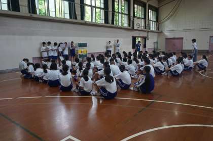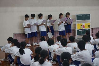 7月9日(火)3・4時間目,昨日の3年生につづき,1年生の球技大会を行いました。梅雨らしい蒸し暑い天気の中,男女とも体育館でバレーボールをしました。まずは,体育委員を中心に開会式を行いました。委員の開会式進行や説明は堂に入ったもの。中学校に入学して3か月。4月初めの登校日の頃の幼さのを思うと,とても中学生らしく立派な姿で,成長の様子が見て取れました。