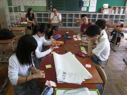 次に、6グループが1・2年生の教室に入って、「みんなが挨拶ができるようになるには、どうしたらよいかを考えました。」 まず、(1)「挨拶をするメリット」を個人で考え、付箋に書きました。次に、(2)「なぜ、挨拶ができないのか」を個人で考え、付箋に書きました。それを模造紙に貼っていき、同じ考えをグループ化して、具体案を考えました。