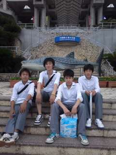「美ら海水族館」の前で、「ハイ ポーズ!」