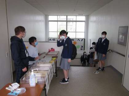 5月19日(火)8:40に3年1組と3組の生徒たちが,学習相談日にやってきました。(2・4組は10:00に登校予定です。)生徒たちは久しぶりの学校を感触を味わいながら,校舎内に入ってきました。受付のところでは,まず担当の先生に健康観察票を出し,体調面を確認しました。次にできている課題を提出しました。順番に適切な距離を保って対応するために,生徒たちは準備された足形の位置で待機していました。