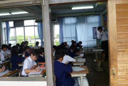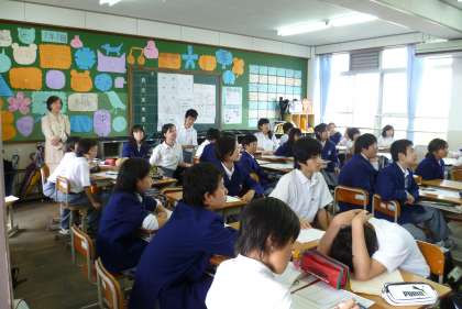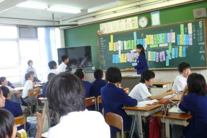 国語は班に分かれて活動し、前の黒板に生徒が自分の考えを貼りに行きました。