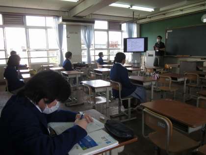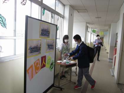 5月20日(水)8:40に1年1組の生徒たちが,学習相談日にやってきました。(2組は10:00,3組は11:20に登校します。)中学校に入学して,わずか2日だけ学校に来て,長期休業に入った1年生を,まずはかわいらしく「みんなおかえり,先生たちはずーと待っていたよ」と書かれたホワイトボードが出迎え,担当の先生の前でアルコール消毒し,体調面を確認しました。そして,指定された教室に入り,テレビ画面に映された座席に座って,朝学活が始まりました。3密に配慮して,窓を開け,座席の間隔も広くあけて座りました。その中で,健康観察票やできている課題を提出しました。