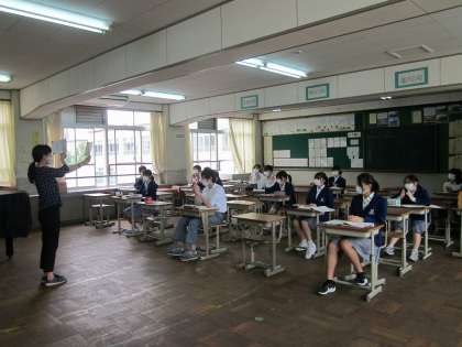 2年生ついて,写真1は音楽の授業の様子です。フラッシュカードを見て,拍子を刻む場面でした。写真2は理科の授業の様子です。元素記号を学習していました。写真3は国語の授業の様子です。先生から説明を聞いた後,聞き取りを行っていました。
