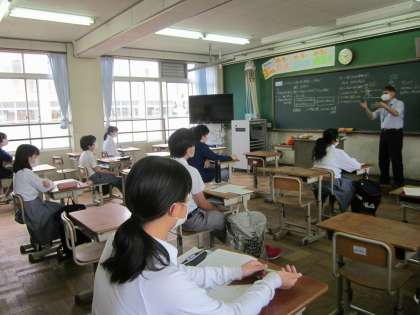 3年生について,写真1は保健の授業の様子です。食生活と健康について考えていました。写真2は技術の授業の様子です。先生の経験談を引き込まれるように聞いていました。写真3は理科の授業の様子です。力の合成について学んでいました。皆さん,集中して頑張っていました。