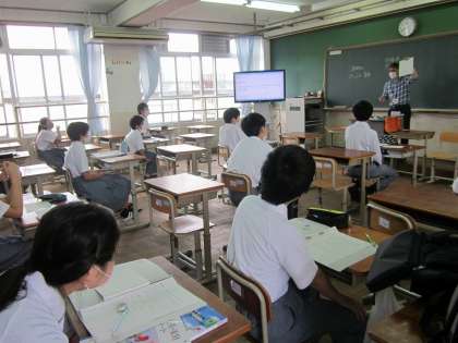 1年生について,写真1は国語の授業の様子です。テレビの画像を見ながら,先生の話を聞き,真剣に考えていました。写真2は英語の授業の様子です。11からの数字について学んでいました。写真3は技術の授業の様子です。A4,A3など用紙の規格について質問に答え,その法則性に気づいていました。