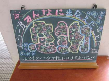 写真1は2年生のフロアの小黒板です。「もう一度みんなに出会えたことに感謝」と書いてありました。写真2は1年生の朝読書の様子です。皆さん,興味のある本を黙々と読んでいました。写真3は育成学級の様子です。これから英語の学習を始めます。
