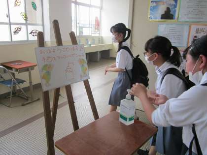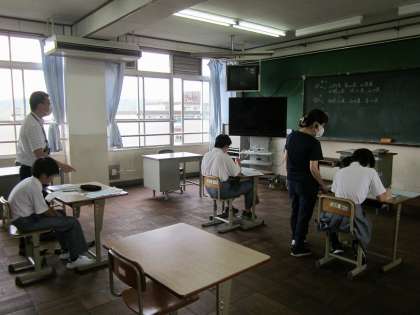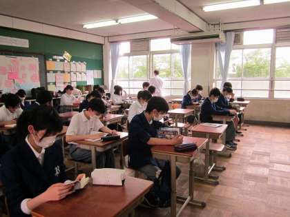 2週間のウォーミングアップ期間を終えて,本日(6月15日)から,学校生活が本格的に再開されました。生徒たちは新しい生活様式によく順応し,登校後はまずアルコール消毒を行い,教室に向かいました。教室では心地よい音楽が流れ,「朝読書」に取り組んでいました。1限目の授業が始まると,育成学級では社会(地理)の授業で,「山」や「川」また「動物」が県名に入っている県を探し,地図帳で位置を確認していました。