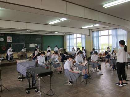 本日から部活動を再開するにあたり,放課後,部集会を持ちました。洛西中学校としての申し合わせ事項を,各顧問の先生から聞いてました。特に吹奏楽部は独自の注意事項もあり,皆さん,真剣に聞いていました。また,接触感染を防ぐために,軍手が配布されました。女子バスケットボール部は,早速,軍手をはめてシュート練習をしていました。
