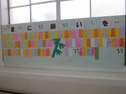 3年生のフロアに向かう階段の踊り場に,「星に願いを」と書かれた模造紙に竹が描かれ,3年生が願いを込めた短冊が貼られていました。中には,次のような願いが書かれていました。