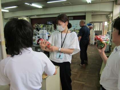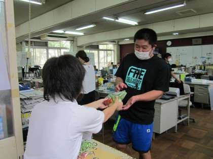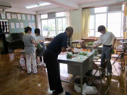 午後から,育成学級では校内菜園で収穫した野菜(トマト・ししとう・なす・レタス等)を袋詰めしていました。そして,職員室に行き,授業でお世話になっている先生方に渡していました。