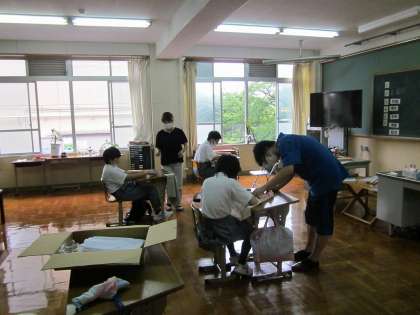 写真1は,育成学級の家庭科の様子です。裁縫の学習でしたが,先生の支援を得ながら,皆さん頑張って取り組んでいました。