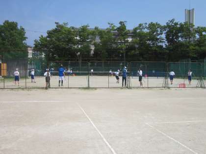 写真1は,男女ソフトテニス部の1・2年生が,サーブやレシーブの練習に励んでいる様子です。