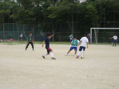 写真3は,サッカー部が,パスを回してシュートする練習に取り組んでいる様子です。ボールをもらった選手にディフェンスがプレッシャーをかけているところです。