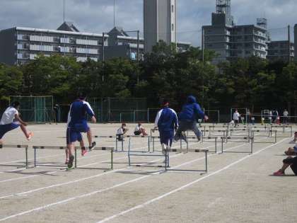 2年生男子に続いて,3年生女子,そして3年生男子へと順次,ハードル走が行われました。3年生女子に交じって,3年生の女性教員1名が一緒に走り,大きな声援を受けていました。続いて,男子のハードル走にも,3年生の男性教員2名が参加し,真剣勝負で競い合っていました。飛び入り参加した2名の男性教員にも,皆さん,快い声援を送っていました。