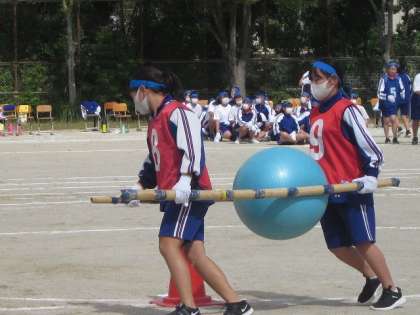 続いて,2年生の学年競技「ボールでGo!Go!」が行われました。入場する時に,1年生の観客席の前を通ると,1年生の皆さんから快い拍手が送られていました。「ボールでGo!Go!」とは,2本の竹の棒で大玉を挟んで,クラス対抗リレーをする競技です。2番手争いが熾烈でした。感染症対策のため,生徒たちはマスクと手袋を着用して実施しました。