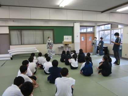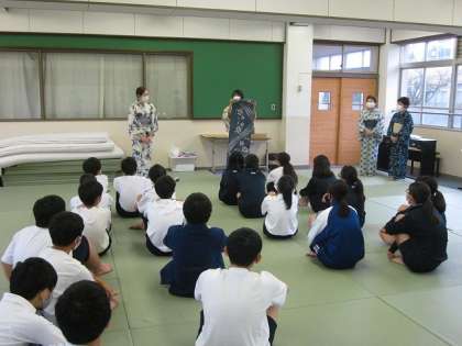 10月8日(木)京都和装教育協議会から4名の講師の先生方をお迎えして,1年生が浴衣着付け授業(家庭科)を行いました。講師の先生方が自己紹介された後,浴衣の起源や作り方などについて,簡単に説明していただきました。そして,座礼をして浴衣着付け授業が始まりました。