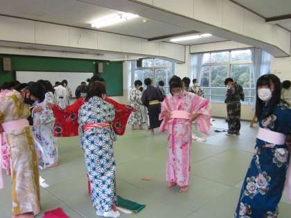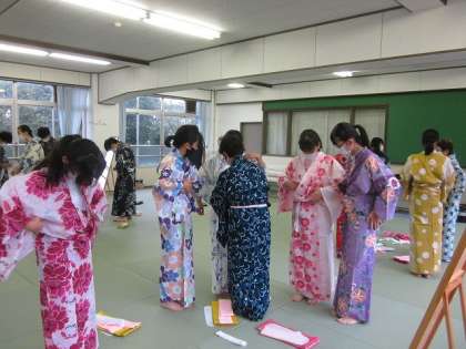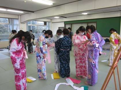 女子も同じく,講師の先生の指示で,まず自分のサイズにあった浴衣を羽織り,腰紐を結びました。次に帯の締め方を丁寧に教えていただき,自分で結ぼうとチャレンジしていました。