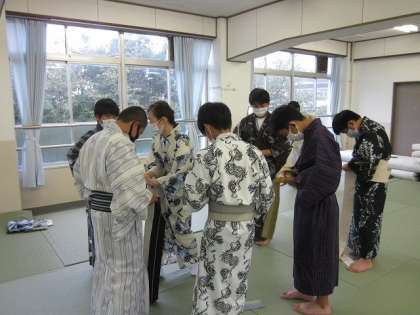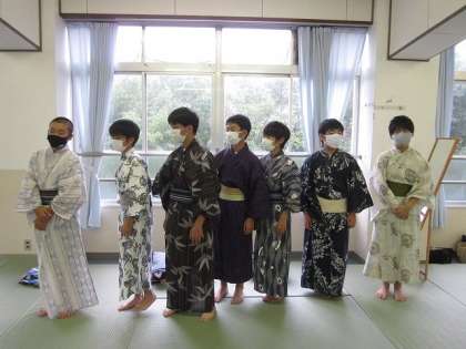 講師の先生に助けていただきながら帯を結ぶことができ,浴衣を無事に着ることができました。その後,班ごとに横一列になって,帯の結び目が見られるように斜めを向いたりしながら,写真を撮りました。