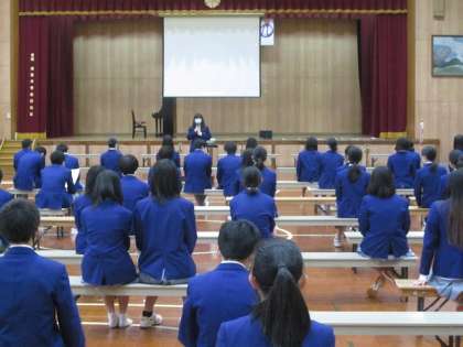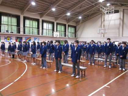 10月9日(金)に,学校祭文化の部を実施しました。今年度は新型コロナウイルス感染拡大防止のため,無観客で規模を縮小して(学年別の合唱コンクールと展示鑑賞のみ)行いしました。合唱コンクールの前に,道徳の授業を行って,クラスメートが心を一つにして取る組む心情を高めました。合唱コンクールの実施にあたっては,各学年ともに文化委員が開会のあいさつを行い,文化委員・吹奏楽部・美術部が協力して作成した文化の部オープニングビデオを見ました。そして,音楽科の先生の指導のもと,学年全体で声出しを行って,合唱コンクールに臨みました。