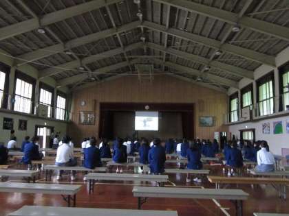 写真1は,3年の部で文化委員長が挨拶をしているところです。写真2は,1年の部でオープニングビデオを見ているところです。写真3は,2年の部で学年全体で声出しをしているところです。