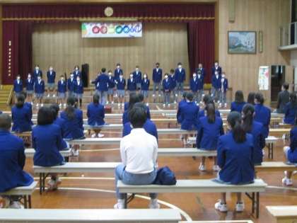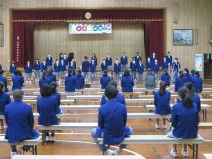 次は2年3・5組で「地球星歌 〜笑顔のために〜」を歌いました。地球の平和を願う心のよりどころを表した曲です。繰り返しの部分が終わると,いっきに盛り上がって迫力がありました。