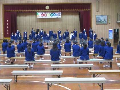 1年の部が終了した後,教職員が長椅子を手際よく消毒し,2年の部が始まりました。最初は2年2・5組で「変わらないもの」を歌いました。「これからも今のまま友達と変わらない関係でいたい!!」と願いを込め,「心の中に」は優しく気持ちを込めて,「つかみ取るんだ」は力強く,意識して歌っていました。