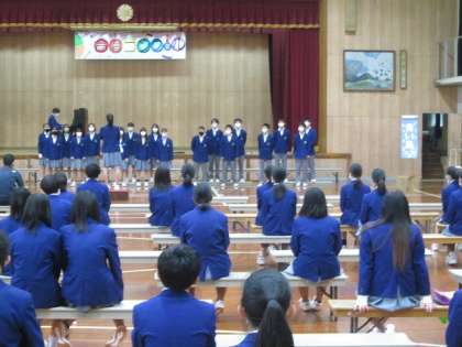 2年の部が終了した後も,教職員が長椅子を手際よく消毒し,3年の部が始まりました。最初は3年3組で「青い鳥」を歌いました。「私たち3年3組に幸せや喜びがおとずれるように」と願いを込め,鳥のようにクラス全員で未来へ向かってはばたくように歌っていました。特に2回目のサビの部分では,少しずつ強くなっていくように意識していました。