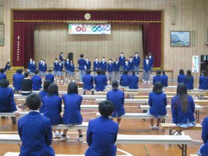 次は3年4・5組で「Gifts」を歌いました。この曲は,リズムが弾んだり落ち着いたりする特徴があります。綺麗な歌詞に込められた思いを,3年4・5組の「元気」「落ち着き」「力強さ」で表現していました。