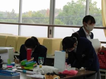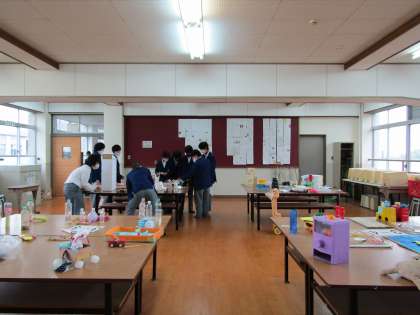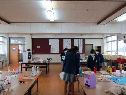 2・3年生の家庭科の展示会場には,2年生が夏休みに調べた「郷土料理新聞」と,3年生が夏休みに製作した「幼児が遊ぶ手作りおもちゃ」が,それぞれクラス単位で展示されていました。3年生が製作した力作のおもちゃを,2年生が興味をもって鑑賞していました。また,感じたことや学んだことを,展示鑑賞用プリントに記入していました。