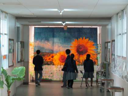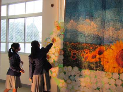 南校舎と北校舎をつなぐ渡り廊下に,2年生が総合的な学習の時間に取り組んできた「東日本大震災」についての学習成果物や感想,また当時の新聞記事などが掲示されていました。その突き当りに,「ひまわりのデジタルアート」がありました。「笑顔になれる瞬間」を書いた「小さなひまわり」を,生徒たちは楽しそうに読んでいました。