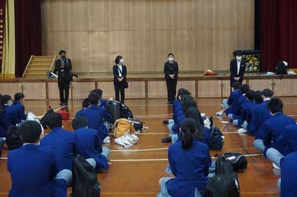 今日は,早朝6時20分に学校集合。まずは結団式を行いました。修学旅行実行委員生徒の司会で,校長先生のあいさつ,実行委員長生徒のあいさつ添乗員さんとカメラマンさんの紹介がありました。修学旅行のスローガンは「Let's enjoy!つながろう〜出逢い 友 いのち〜」で,3年生全員の友情や学び,広島での出逢いを大切にするという思いが込められています。少し遅れた生徒もいましたが,みんな元気そうです。