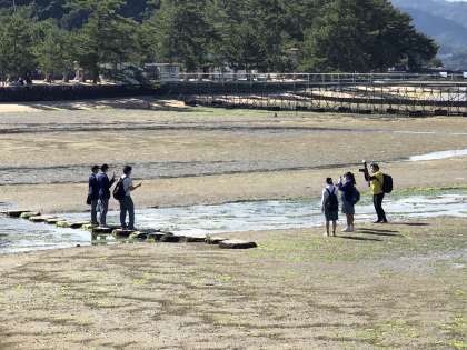 昼食後は,宮島の散策に出かけます。厳島神社でお祈りしている生徒と先生,大願寺の前でいる生徒と先生,引き潮のところで写真を撮ってもらっている生徒,思い思いに過ごしています。