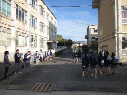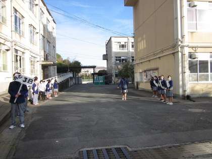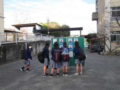 11月26日(木)8:05〜8:20まで,生徒会本部役員立候補者が選挙運動2日目を行いました。2日目となり,各立候補者も少し慣れてきたようで,昨日よりも大きな声で,「おはようございます。〇〇候補の□□です。よろしくお願いします。」などと,元気に声をかけていました。選挙管理委員会からは,「選挙まであと3日です。」と,プラカードを持って呼びかけてくれていました。立候補者の氏名入り写真が貼ってある掲示板をよく見てから,教室に向かう生徒もいました。