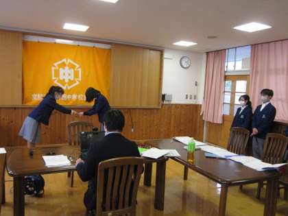 12月10日(木)6限にZoomを利用して,生徒会本部役員並びに後期評議・専門委員の認証式を実施しました。最初に,校長先生から新本部役員に認証書が手渡されました。その様子をテレビ画面で見ながら,快い拍手が起こっているクラスがありました。次に,新本部役員がZoomを通して挨拶を行い,その後,各クラスの評議・専門委員の認証を行ってくれました。それを受け,担任の先生から認証書が各委員に手渡されました。そして,旧本部役員から新本部役員に向けて,缶バッチを渡すとともに,自らの思いを伝えて,新本部役員を激励してくれました。最後に,校長先生から旧本部役員の1年間の取組に対し,具体例を挙げながらお礼の言葉がありました。また,新本部役員の皆さんに,良き伝統を引き継ぎながら,新たな洛西中学校を築いていってくださいと激励の言葉がありました。