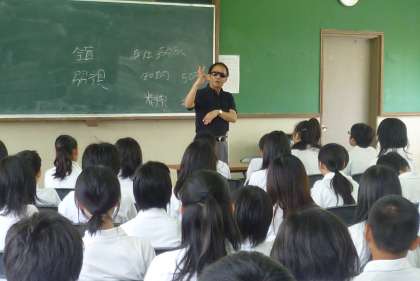 その中で、7月12日と14日には「松永信也さん」に講師として来ていただき、視覚障害者としての自身の体験を交えたご講演と、ボランティアの方々にもお手伝いをいただき、各クラスごとに「手引き体験(アイマスク体験)」や「点字学習」を実際に経験し、視覚障害のある人々の理解を深める学習に取り組みました。