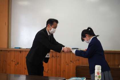 1人目は,2年生男子生徒が京都府学校図書館協議会主催の読書感想文京都府コンクールで「佳作」となりましたので,校長先生から賞状が伝達されました。2人目は,京都新聞書き初め展で「佳作」となった1年生女子生徒に,同じく校長先生からメダルが授与されました。