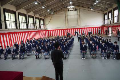 明日の新入生登校は午前9時20分です。今日と同じ,自分のクラスに集合してください。開式は10時を予定しています。持ち物は,配布プリントが入るカバンと筆記用具です。今日の練習どおり立派な式となるよう期待しています。明日,元気に登校して来て下さい。