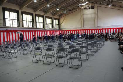 国歌・校歌清聴の後,校長先生の式辞がありました。学校教育目標の「自立・貢献・夢さがし 〜誇りをもって,自らの未来を切り拓く,たくましい生徒を育てる〜」を達成するために,大切にしてほしいことを二つ話されました。一つ目は,授業の中で一つ一つの知識がつながり,「わかったできた」「できた」「おもしろい」など,「学ぶ楽しさ」と「わかる喜び」を心と体で感じ取ってくださいとのことでした。二つ目は,お互いの良さや違いを認め尊重し合って,支え高め合える「仲間づくり」を大切にしてくだいさいとのことでした。皆さん,とても真剣に集中して話を聞いていました。