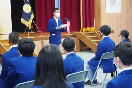 次に,新入生代表生徒から,「この三年間を通して,自分の夢を見つけ,それを達成できるように,毎日を大切に過ごしたい。壁にぶつかることがあっても,仲間と支え合い乗り越えたい。また,家族や友達,これからお世話になる先生方や先輩方への思いやりを忘れないようにします。」との力強い「誓いの言葉」を述べてくれました。