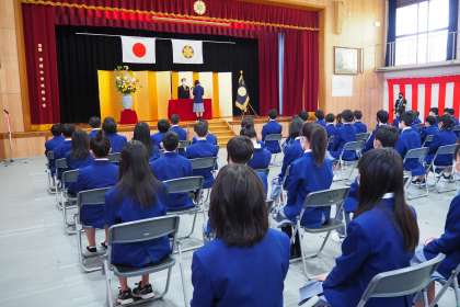 続いて在校生代表生徒より,「皆様に,大切にしてほしいことを三つお伝えします。一つめは,周りの人を大切にすること。二つめは,努力すること。三つめは,色々なことに挑戦すること。この三つのことを大切にし,やりがいのある中学校生活を送ってください。」と,「歓迎の言葉」が新入生に贈られました。
