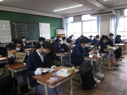 4月13日(火)2年生のフロアにある掲示板には,「あなたの気持ちで,あきらめず,あまえず,あいをもって,あいさつもしっかりネ!」と書かれていました。始業のベルとともに心地よい音楽が流れ,朝読書の時間が始まりました。学級文庫を利用したりしながら,2年生が朝読書に取り組んでいました。読書の楽しさを知ってもらえれば嬉しいです。